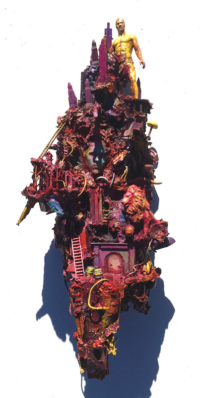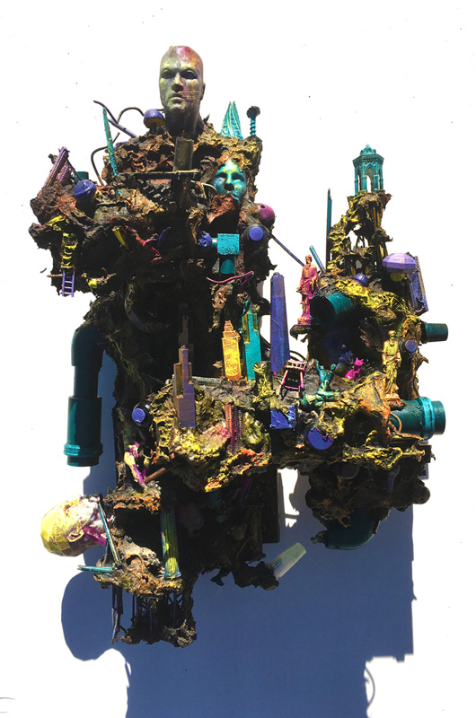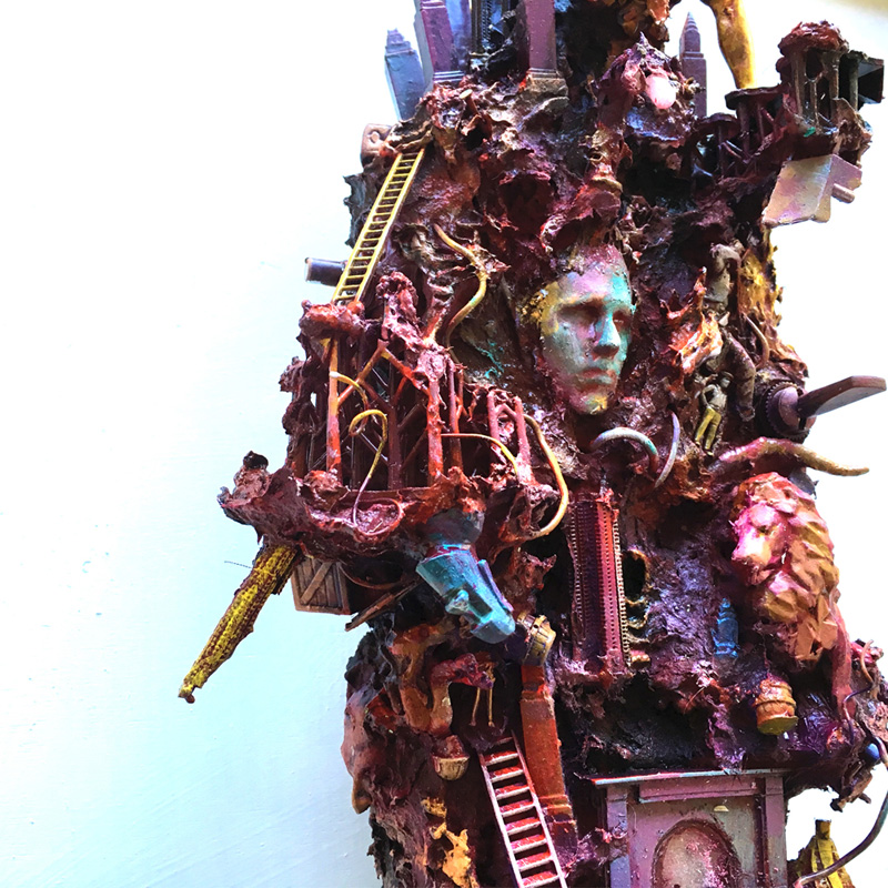 Postdigital Surrealist landscapes featuring 3D prints, found objects, programmed lighting and embedded electronics.