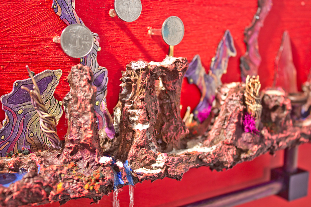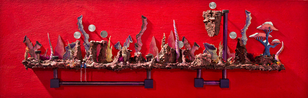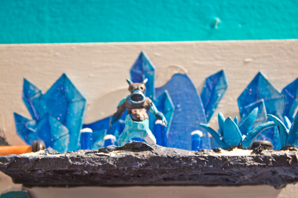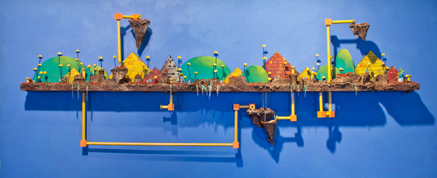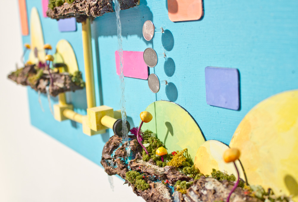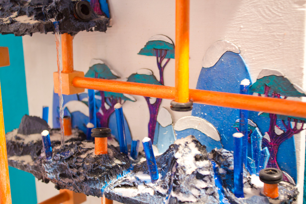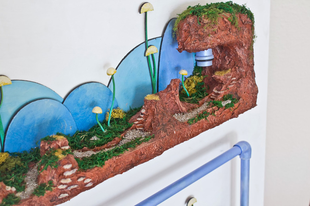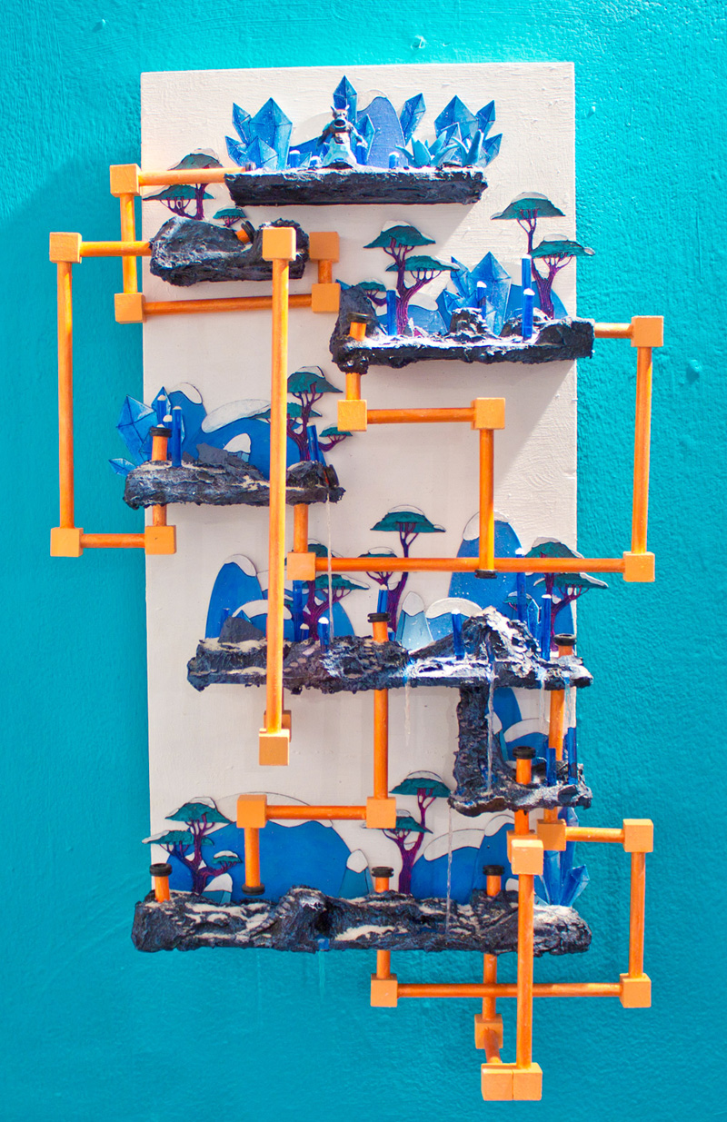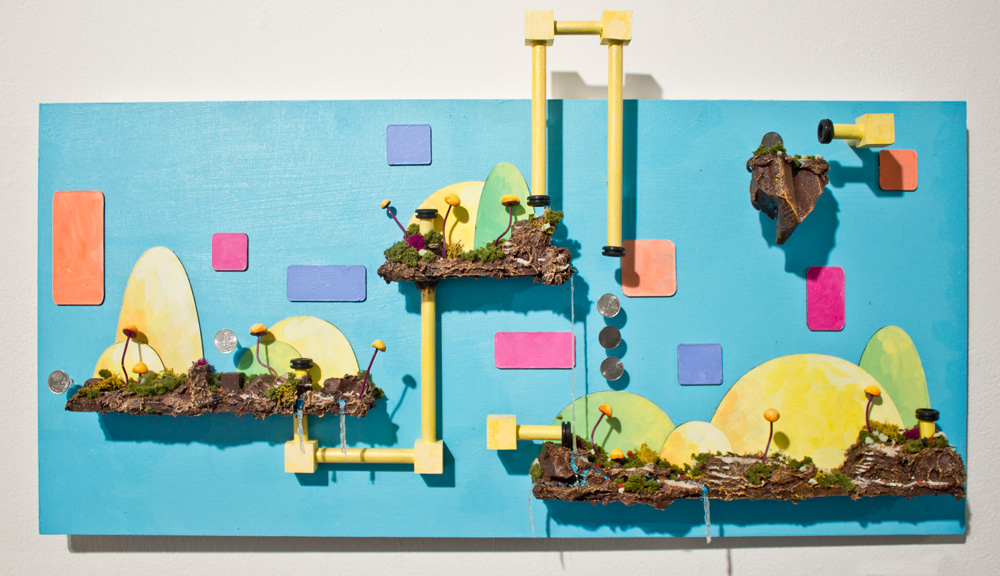 These miniature landscapes echo invoke a retro video game aesthetic with laser cut background shapes, bold colors, and repeated objects.