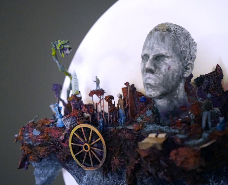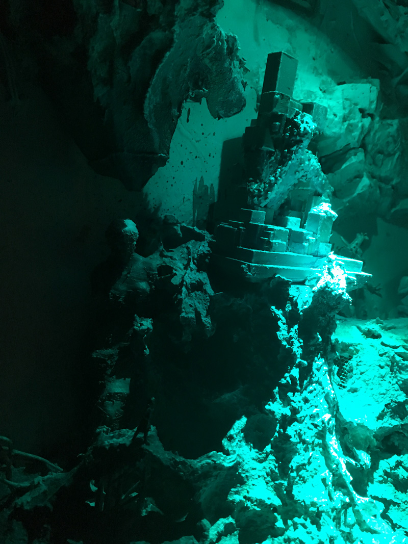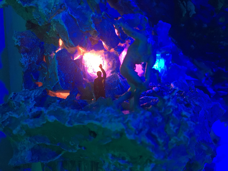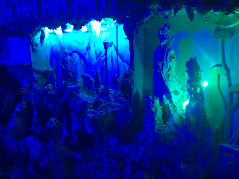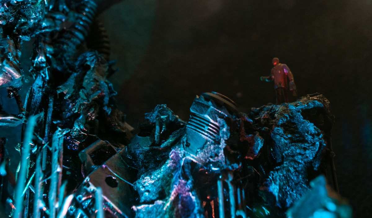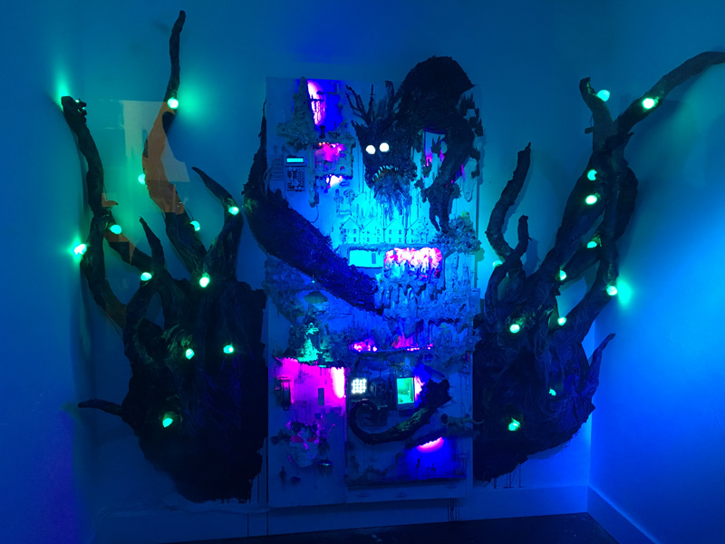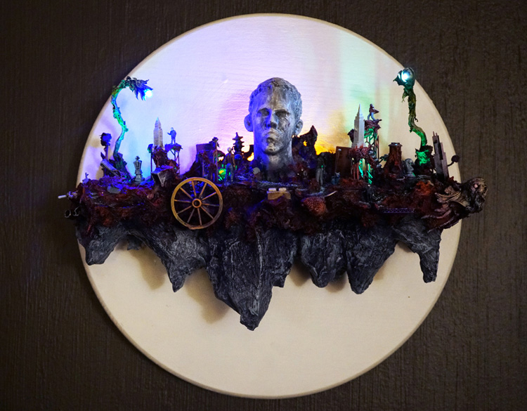 Postdigital Surrealist landscapes featuring 3D prints, found objects, programmed lighting and embedded electronics.